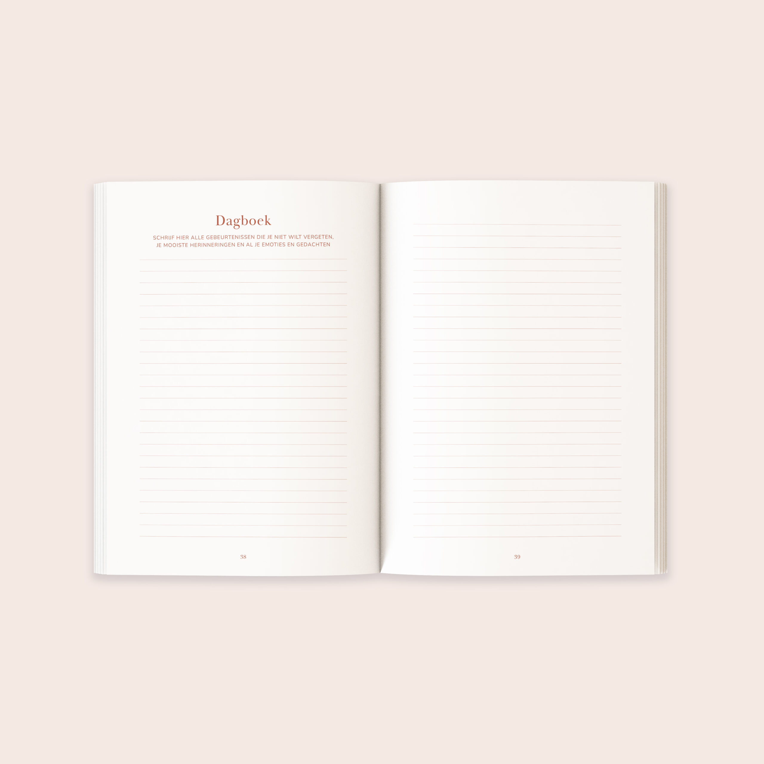 Deze dagboek is speciaal voor jou, om je reis van vrouw naar moeder te documenteren. Op deze manier kun je deze herinneringen altijd bewaren in je hart en op papier.
