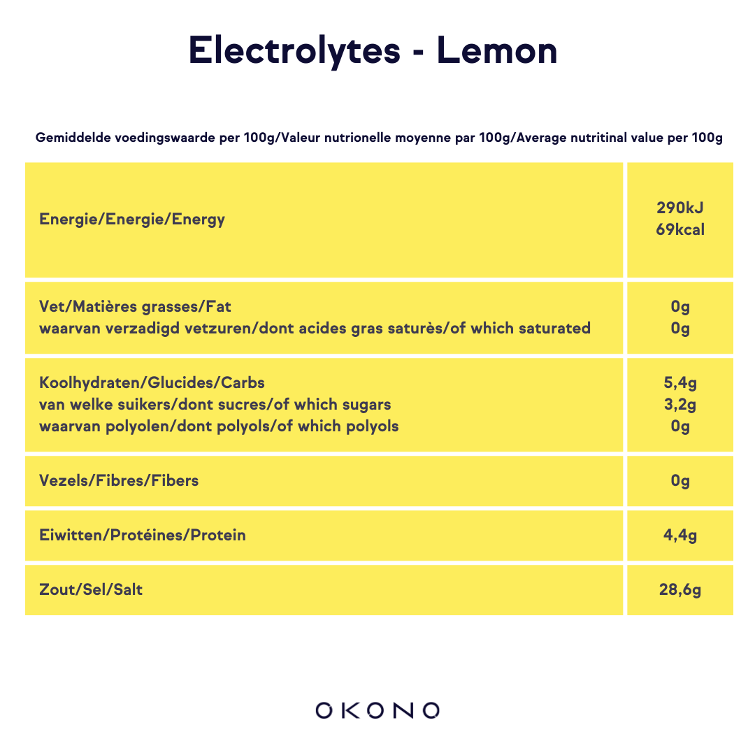 Ingrediënten: keltisch zeezout, appelzuur, kaliumchloride, voedingszuur: citroenzuur, natuurlijk citroen aroma, magnesiumbisglycinaat, kleurstof: kurkuma, nicotinamide (vitamine B3), cyanocobalamine (vitamine B12), pyridoxine (vitamine B6), foliumzuur (vitamine B11), biotine (vitamine B8).